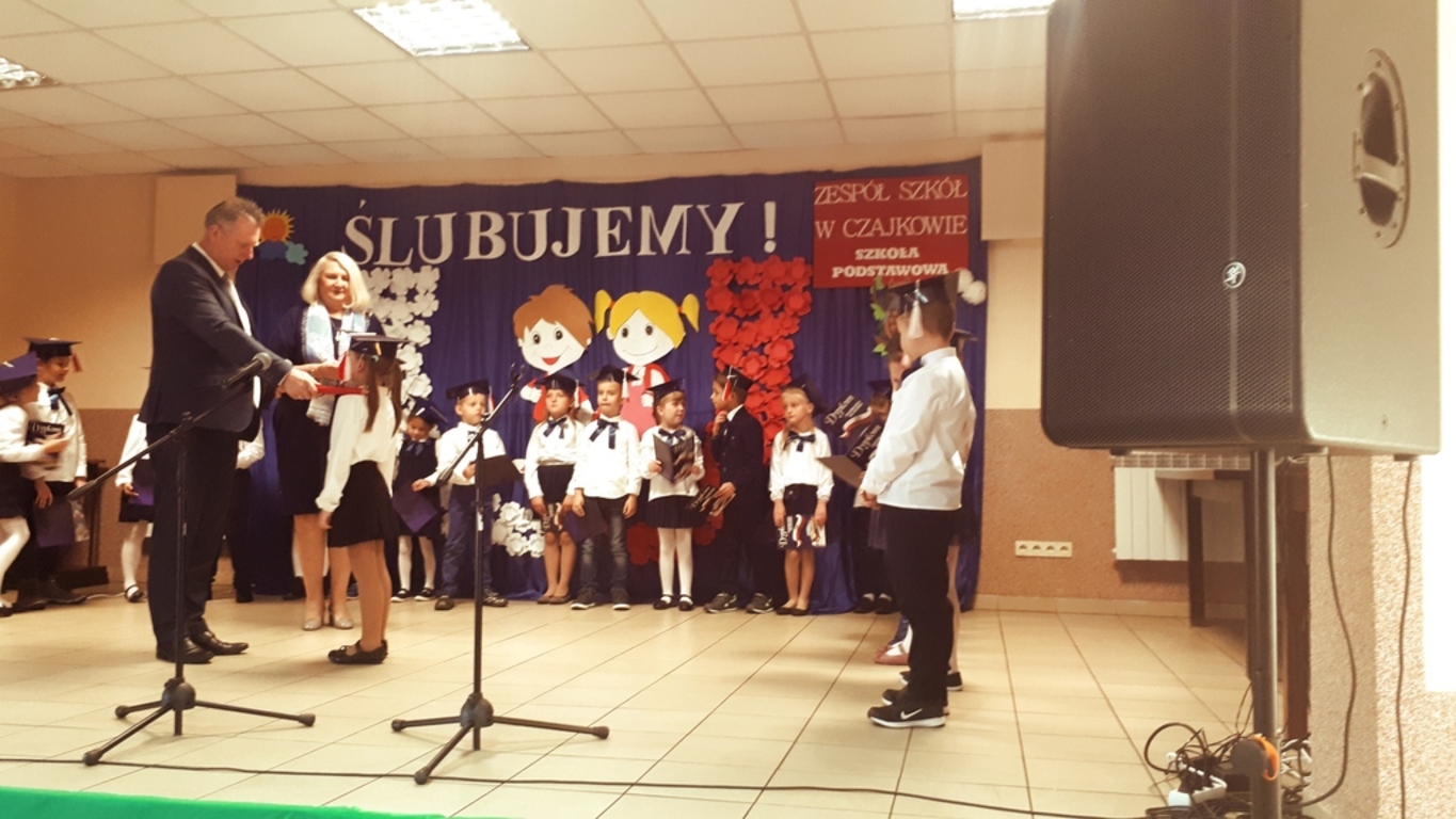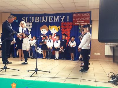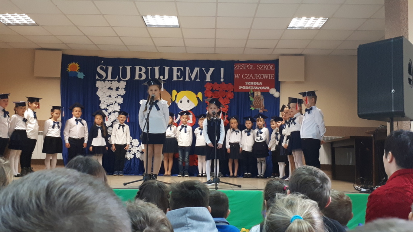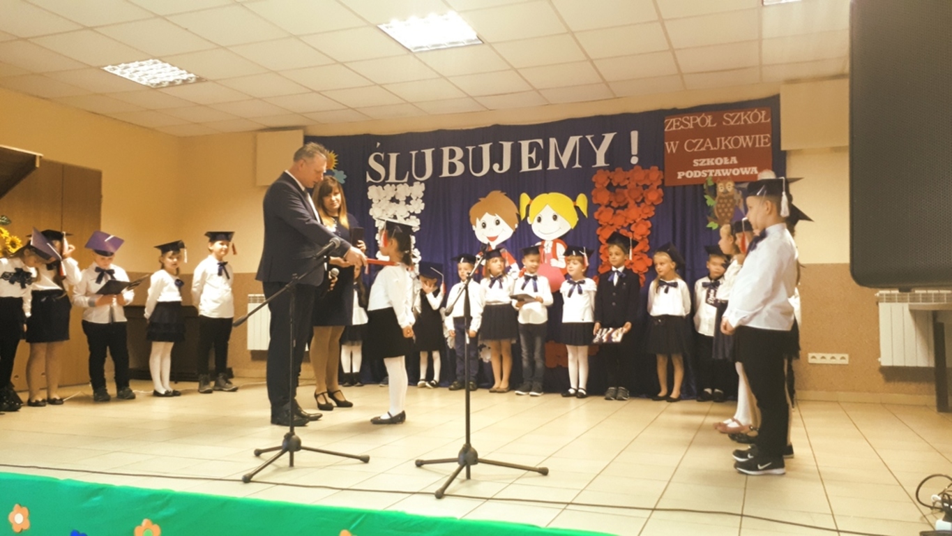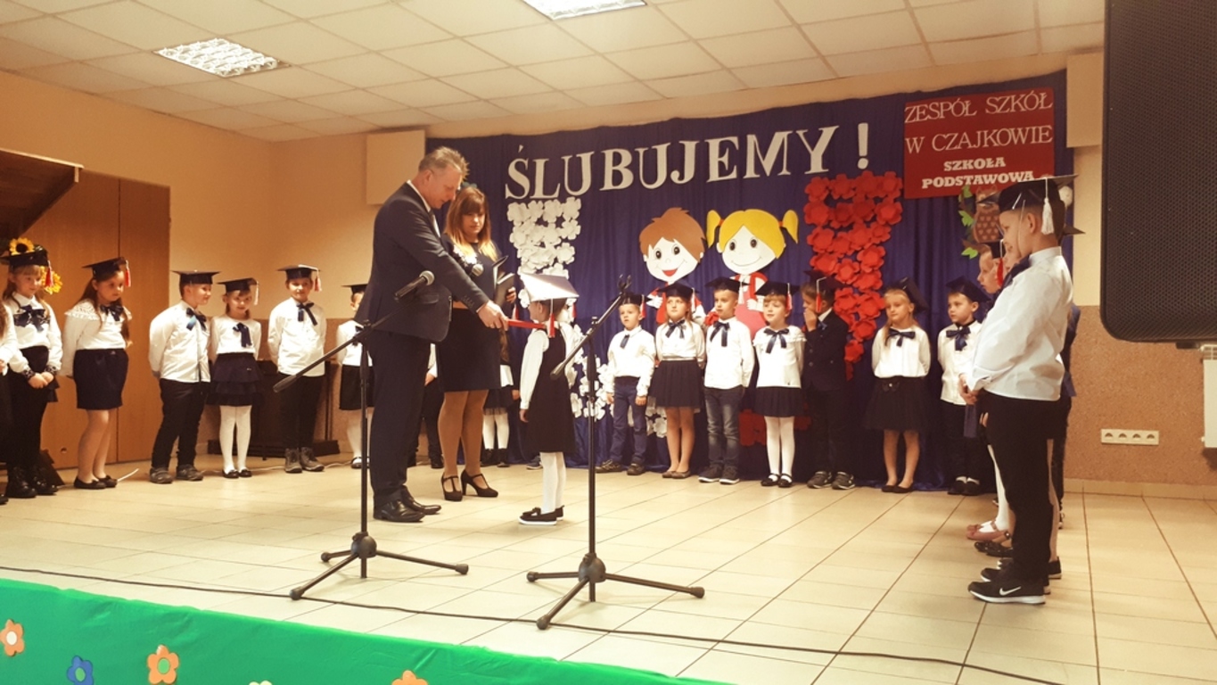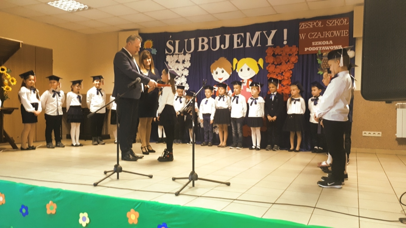 24 PAŹDZIERNIKA W DOMU KULTURY W CZAJKOWIE UROCZYSTE PASOWANIE NA UCZNIÓW NASZEJ SZKOŁY Z RĄK PANA DYREKTORA ZBIGNIEWA PILARCZYKA PRZYJĘLI UCZNIOWIE KLAS I. Z TEJ OKAZJI UROCZYSTĄ AKADEMIĘ PRZYGOTOWALI UCZNIOWIE KLAS PIERWSZYCH POD OPIEKĄ WYCHOWAWCZYŃ PANI ELŻBIETY KĘDZI ORAZ PAULINY WĄGROWSKIEJ. NA KONIEC UROCZYSTOŚCI STARSI UCZNIOWIE ORAZ RODZICE WRĘCZYLI PIERWSZOKLASISTOM UPOMINKI.