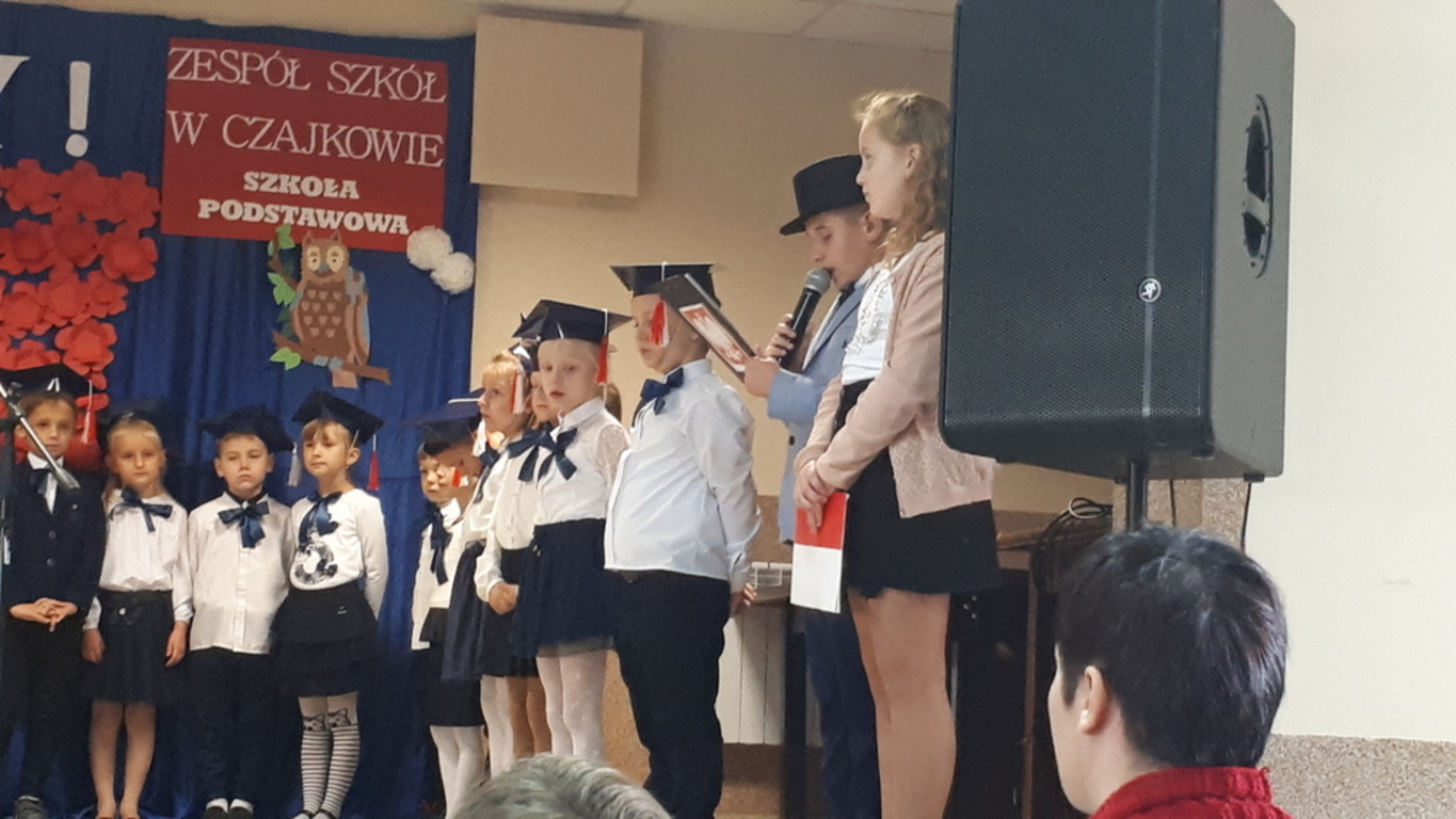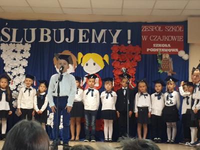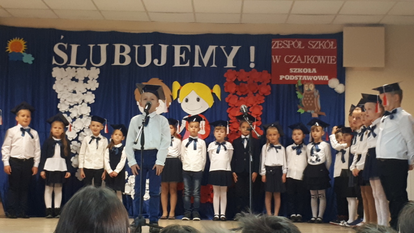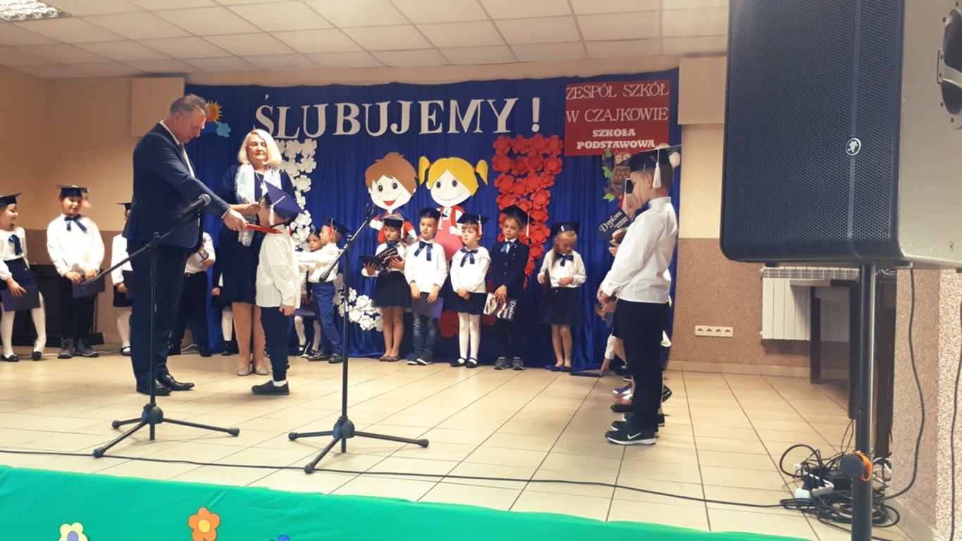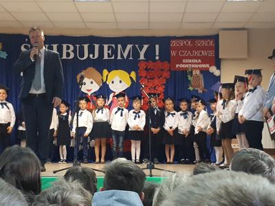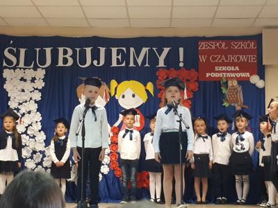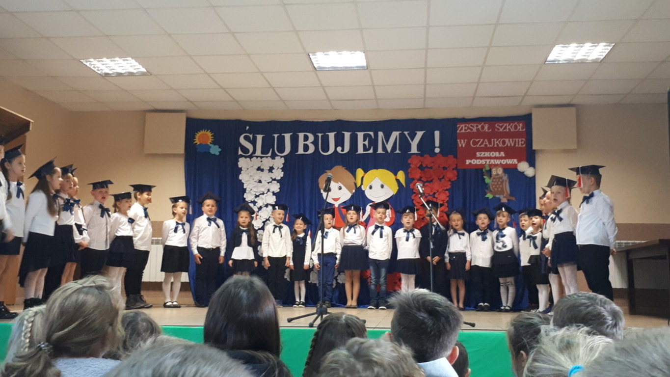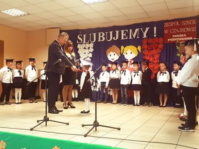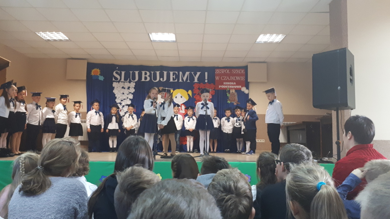 24 PAŹDZIERNIKA W DOMU KULTURY W CZAJKOWIE UROCZYSTE PASOWANIE NA UCZNIÓW NASZEJ SZKOŁY Z RĄK PANA DYREKTORA ZBIGNIEWA PILARCZYKA PRZYJĘLI UCZNIOWIE KLAS I. Z TEJ OKAZJI UROCZYSTĄ AKADEMIĘ PRZYGOTOWALI UCZNIOWIE KLAS PIERWSZYCH POD OPIEKĄ WYCHOWAWCZYŃ PANI ELŻBIETY KĘDZI ORAZ PAULINY WĄGROWSKIEJ. NA KONIEC UROCZYSTOŚCI STARSI UCZNIOWIE ORAZ RODZICE WRĘCZYLI PIERWSZOKLASISTOM UPOMINKI.