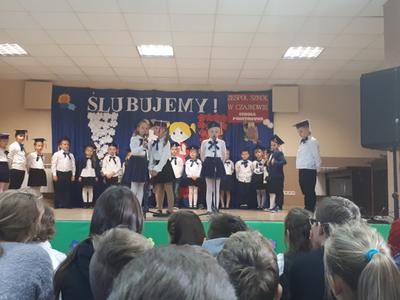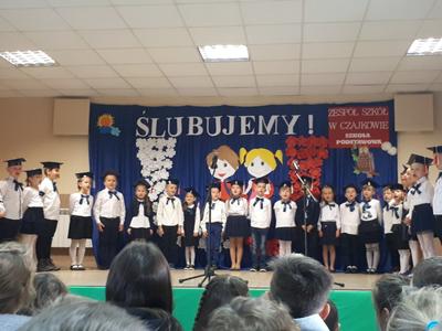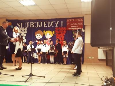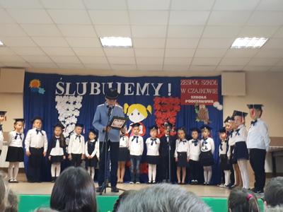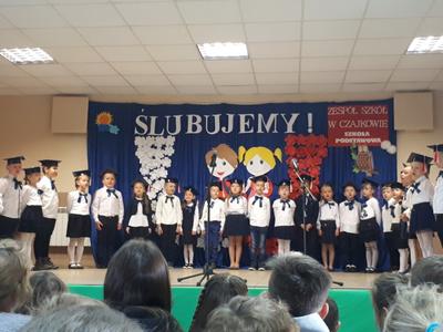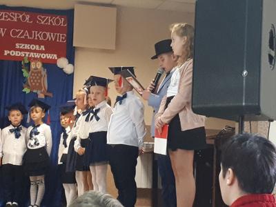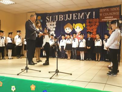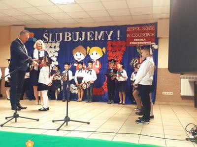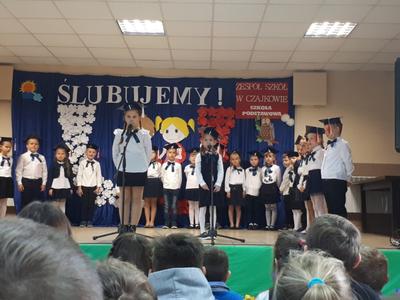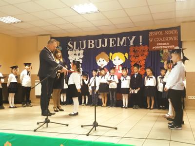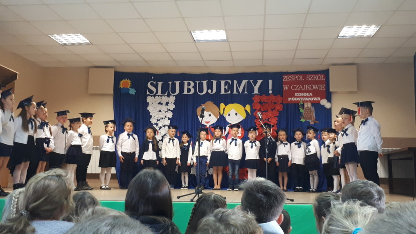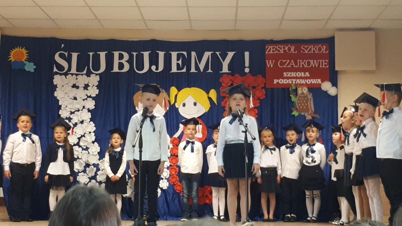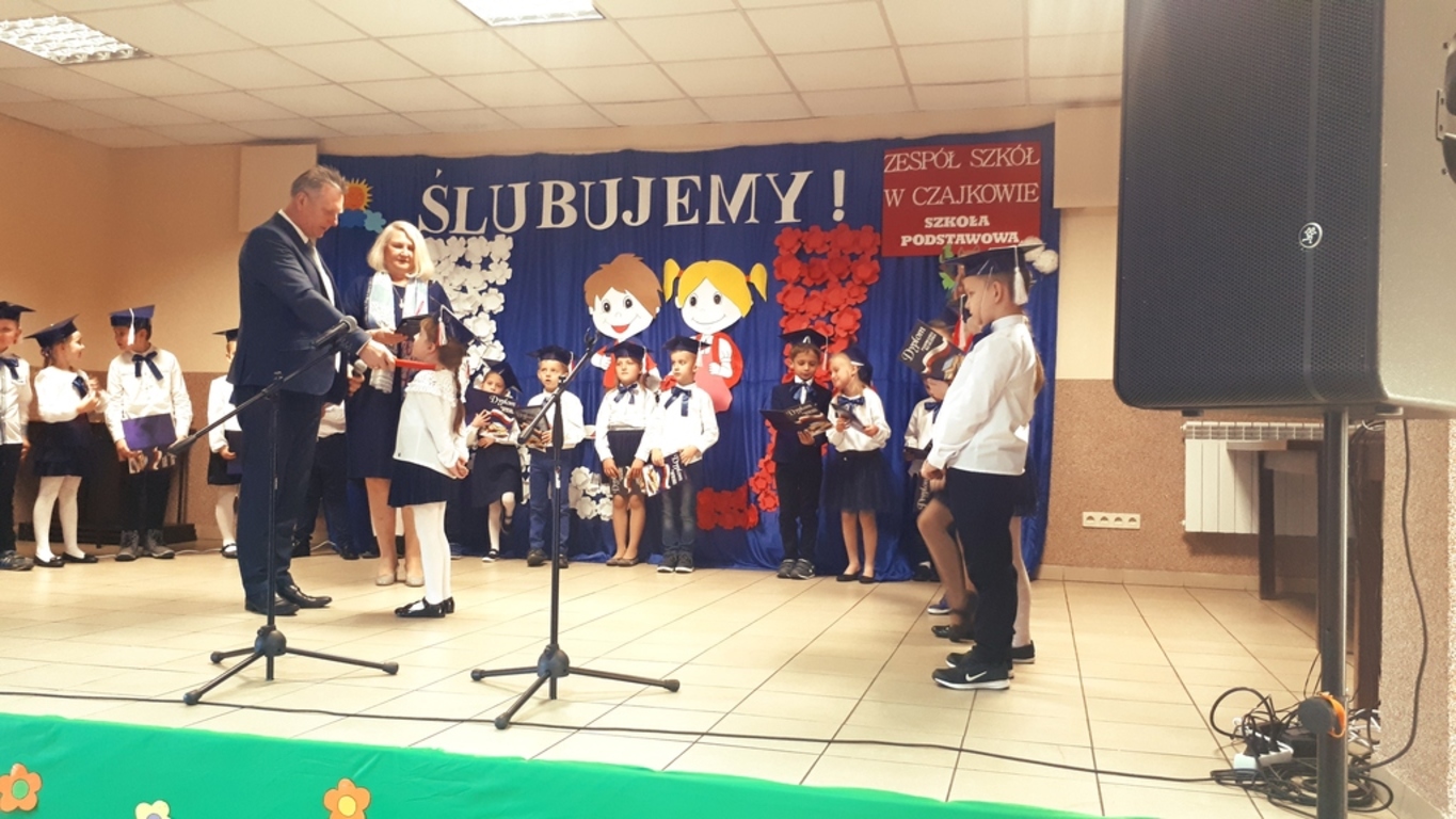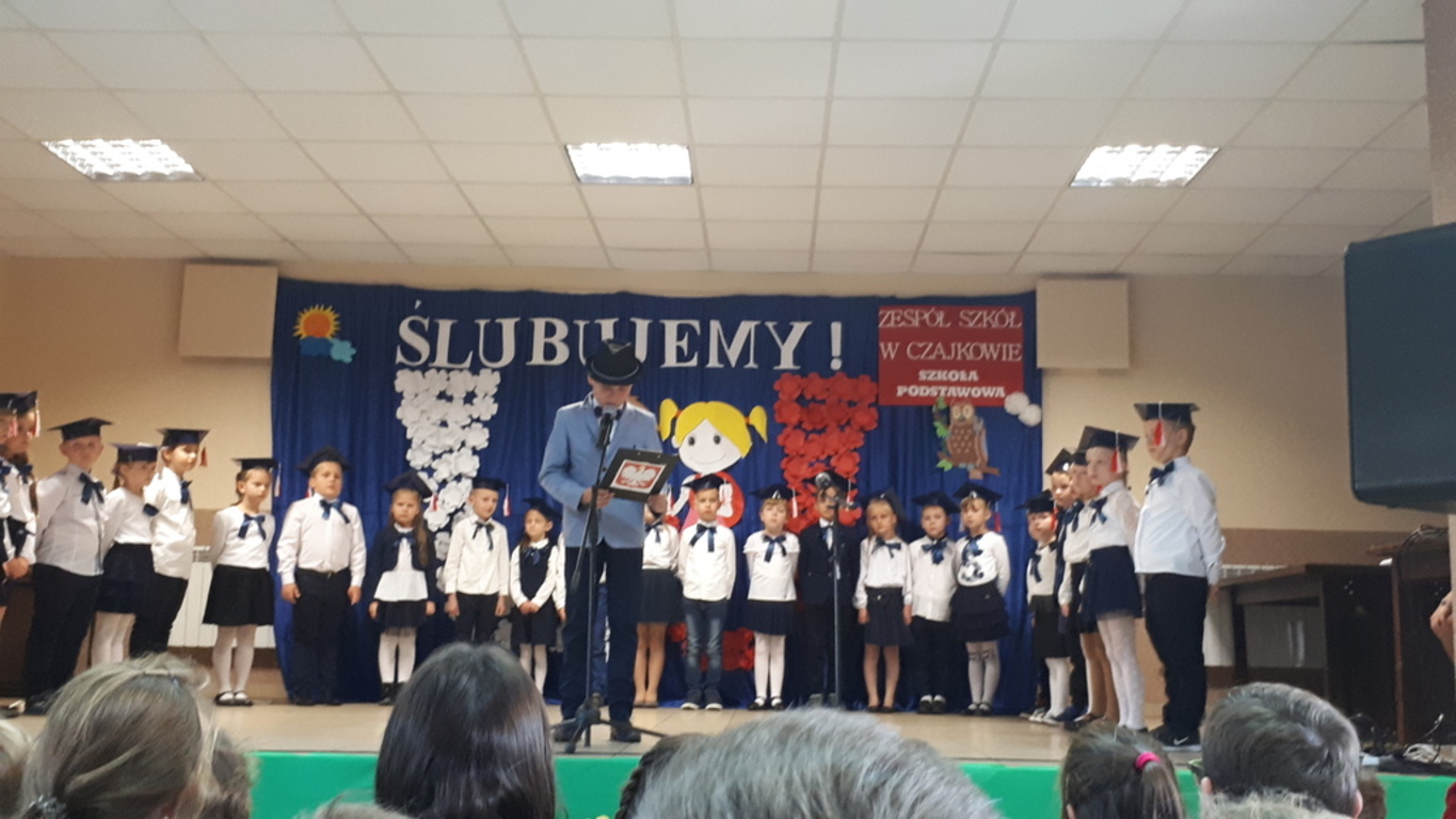 24 PAŹDZIERNIKA W DOMU KULTURY W CZAJKOWIE UROCZYSTE PASOWANIE NA UCZNIÓW NASZEJ SZKOŁY Z RĄK PANA DYREKTORA ZBIGNIEWA PILARCZYKA PRZYJĘLI UCZNIOWIE KLAS I. Z TEJ OKAZJI UROCZYSTĄ AKADEMIĘ PRZYGOTOWALI UCZNIOWIE KLAS PIERWSZYCH POD OPIEKĄ WYCHOWAWCZYŃ PANI ELŻBIETY KĘDZI ORAZ PAULINY WĄGROWSKIEJ. NA KONIEC UROCZYSTOŚCI STARSI UCZNIOWIE ORAZ RODZICE WRĘCZYLI PIERWSZOKLASISTOM UPOMINKI.