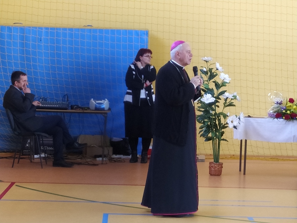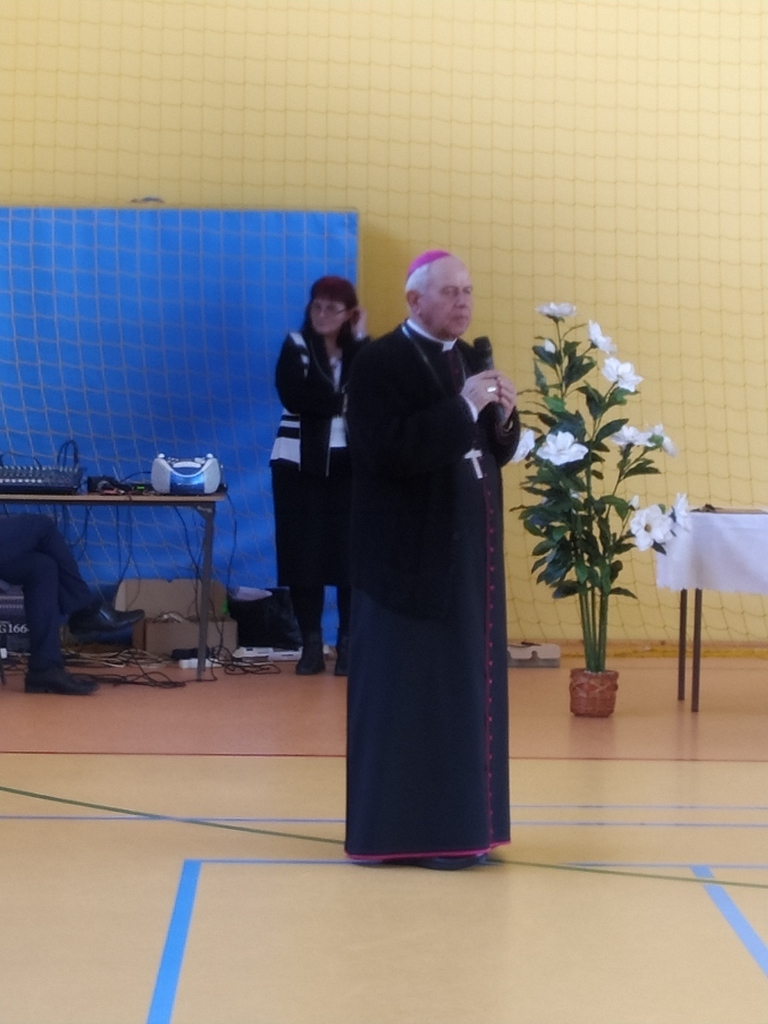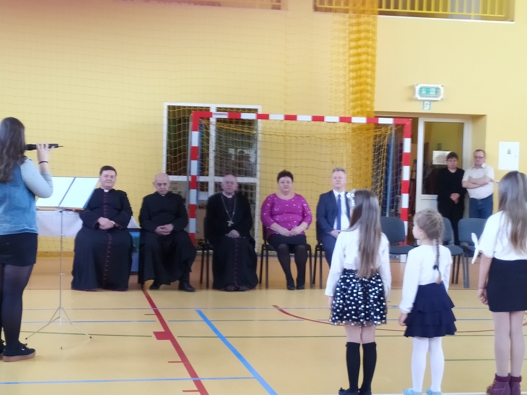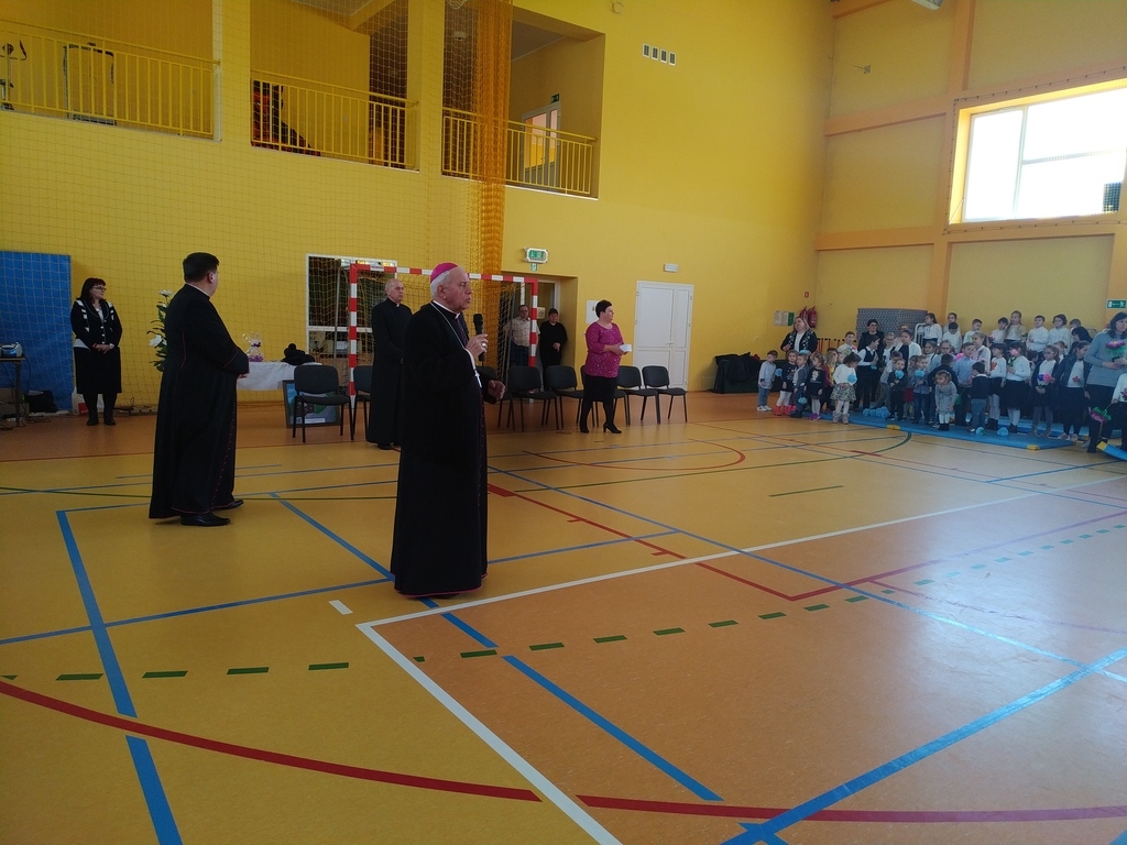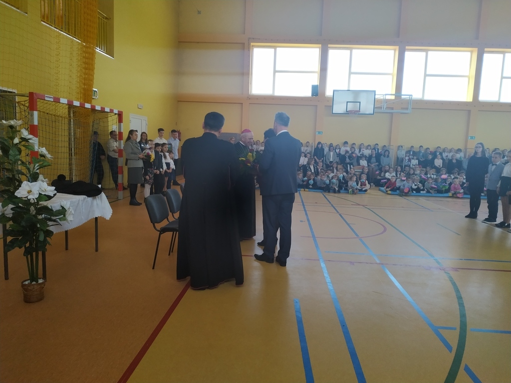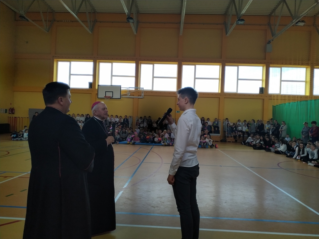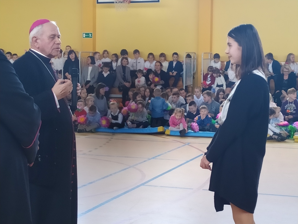 Dnia 13.03.2019 r. gościł w naszej szkole Ksiądz Biskup Stanisław Napierał. Pan Dyrektor Zbigniew Pilarczyk wraz z Panią wicedyrektor Barbarą Garncarek serdecznie powitali przybyłego gościa, i wręczyli mu kwiaty. Ksiądz Biskup wysłuchał krótkiego programu artystycznego, w którym uczniowie zaprezentowali swoje umiejętności. Następnie uczniowie naszej szkoły wręczyli ks. Biskupowi własnoręcznie wykonane upominki. Zwracając się do zebranych ze Słowem Bożym ks. Biskup podkreślił, jak ważne w dzisiejszych czasach jest wychowanie i uczenie młodego pokolenia wiary, tradycji oraz miłości do Ojczyzny i drugiego człowieka. Wyraził również radość z zamiłowania uczniów naszej szkoły do śpiewu i chęci do rozwijania talentów. Spotkanie zakończyło się udzieleniem pasterskiego błogosławieństwa dla całej społeczności szkolnej. Było to niezwykłe i wzruszające wydarzenie w życiu naszej szkoły. Pozwala dostrzec, że wśród wartości, które wprowadza w życie dziecka szkoła, są też wartości chrześcijańskie i patriotyczne.