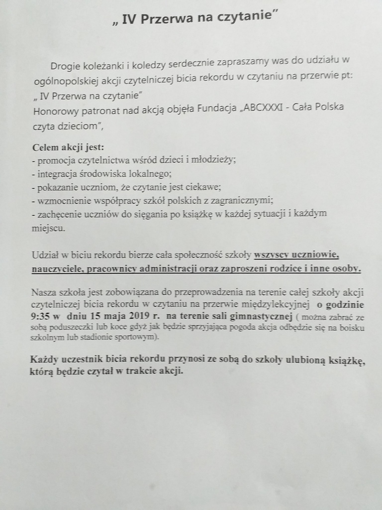 IV PRZERWA NA CZYTANIE Zdjęcia Zobacz również SETNA ROCZNICA ODZYSKANIA PRZEZ POLSKĘ NIEPODLEGŁOŚCI SETNA ROCZNICA ODZYSKANIA PRZEZ POLSKĘ NIEPODLEGŁOŚCI WYWIADÓWKA IV PRZERWA NA CZYTANIE DZIEŃ DZIECKA 2019 SPOTKANIE Z RODZICAMI 10 maja 2019 Ogłoszenia Wydrukuj Udostępnij Wyświetlono: 298