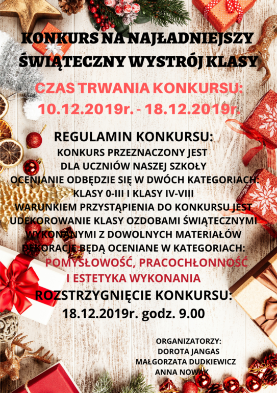 Konkurs Na Świąteczny Wystrój Klasy Zdjęcia Zobacz również IV PRZERWA NA CZYTANIE DZIEŃ DZIECKA 2019 SPOTKANIE Z RODZICAMI Konkurs Na Świąteczny Wystrój Klasy Ogłoszenie o pracę - pedagog szkolny Praca dla psychologa 09 grudnia 2019 Ogłoszenia Wydrukuj Udostępnij Wyświetlono: 234