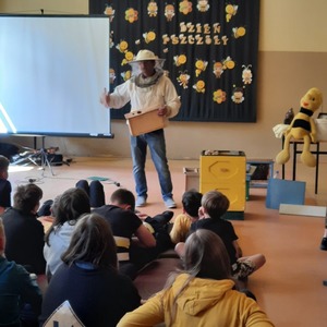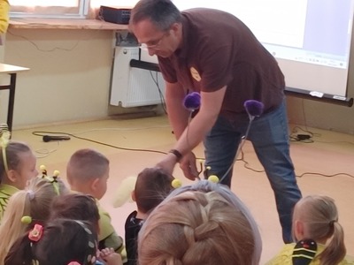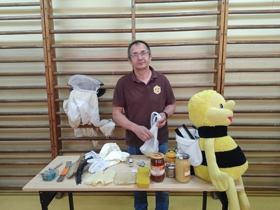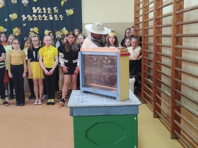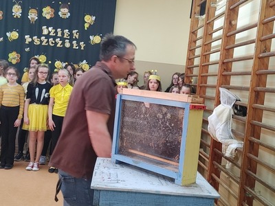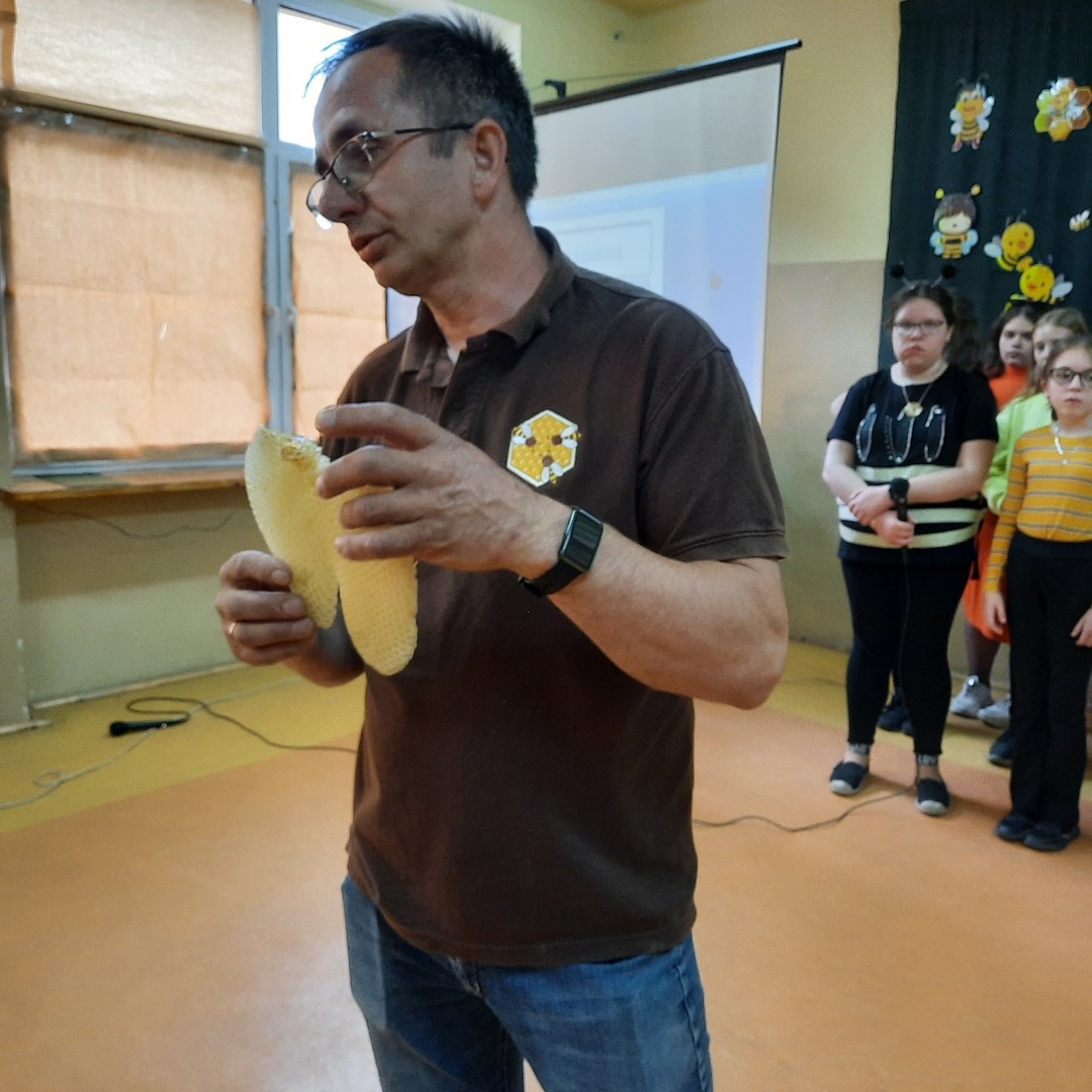 Pan Jan Baś, pszczelarz, opowiedział zebranym o swojej pracy, pokazał narzędzia, które wykorzystuje w swojej pasiece.