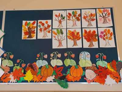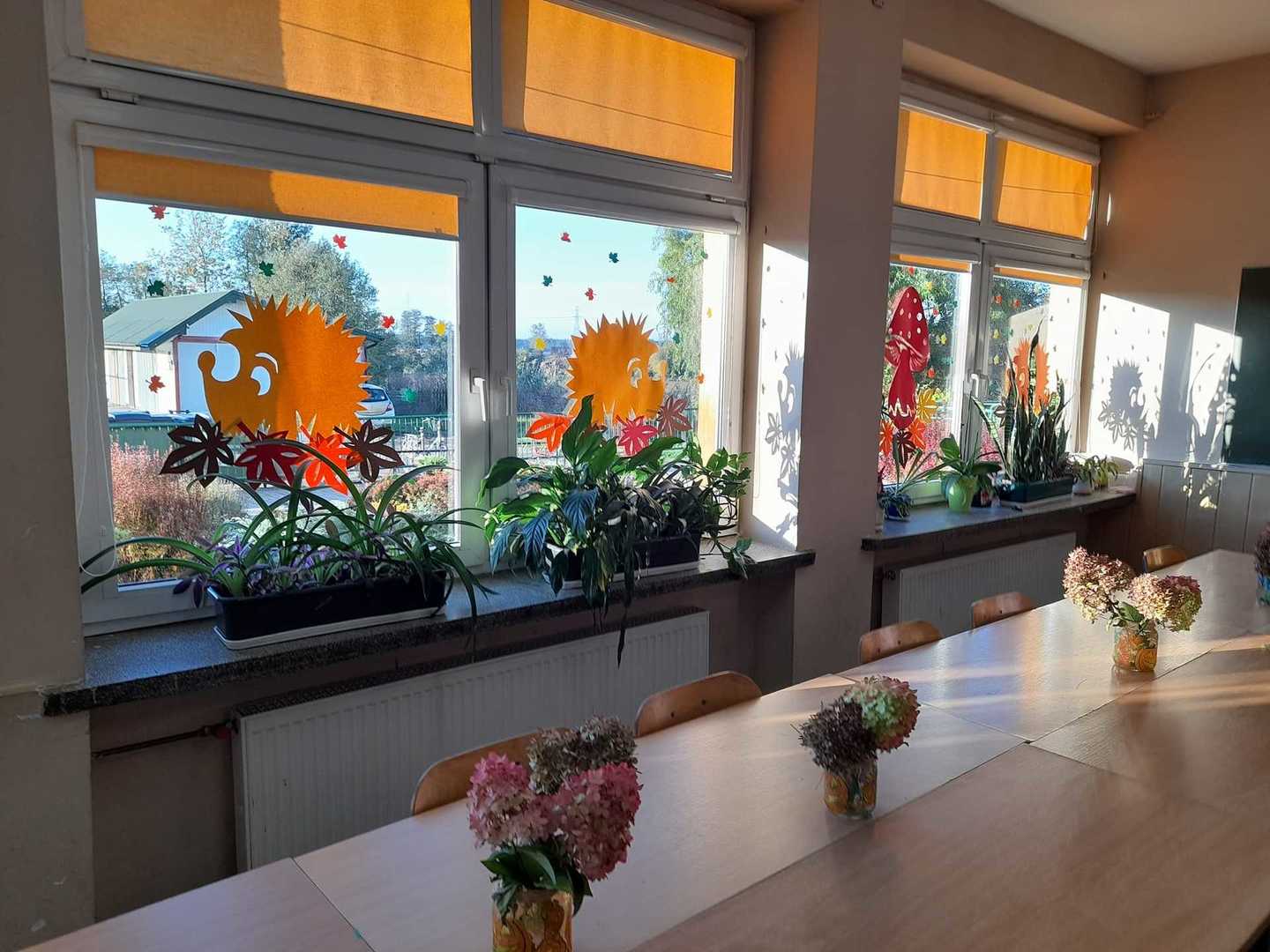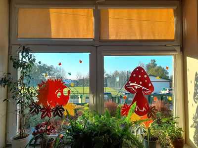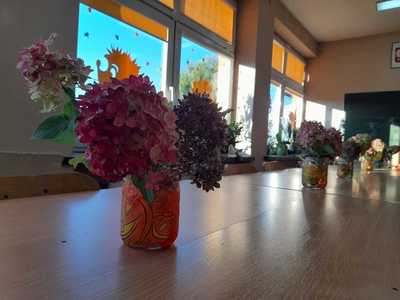 Wychowankowie naszej świetlicy z radością powitali Panią Jesień. Widać ją w świetlicy szkolnej, a także na korytarzu, gdzie zobaczyć można piękną jesienną dekorację. Uczniowie pod okiem wychowawców świetlicy wykonali jesienne kolorowe liście, ozdobili słoiki używając farb, brokatów, serwetek. Tak pięknie ozdobione słoiki pełnią funkcję jesiennych wazoników, które zostały wypełnione suszonymi kwiatami. Zaangażowanie dzieci podczas zajęć pokazuje ich wrażliwość na piękno otaczającej przyrody. Samodzielnie wykonana dekoracja pozwala nam miło spędzić czas i wprowadza do świetlicy pogodną atmosferę.