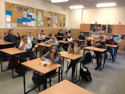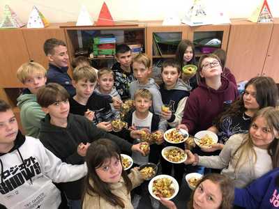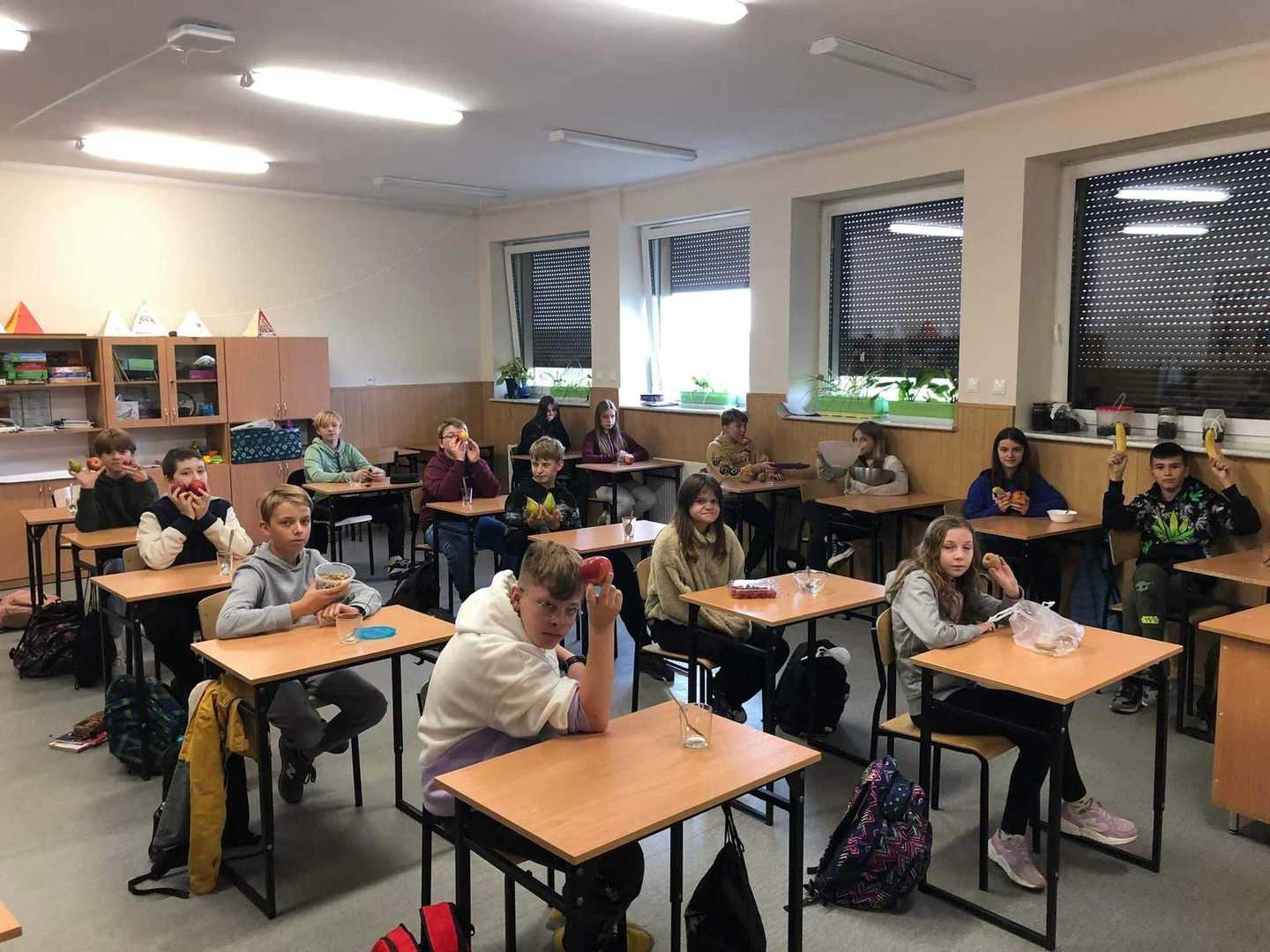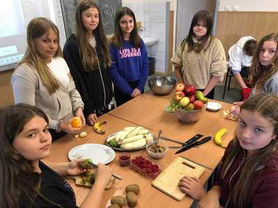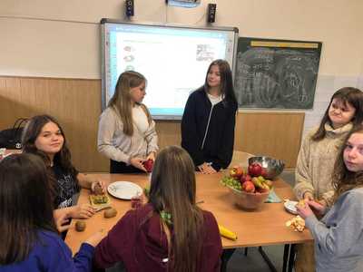 Dnia 19 października uczniowie klasy 7 w ramach zajęć z biologii o tematyce „Witaminy i składniki odżywcze” wybrali się w podróż po zdrowie i przygotowali sałatkę owocową. Przed przystąpieniem do pracy, przypomniane zostały zasady zdrowego odżywiania oraz zasady higieny. Po umyciu rąk i owoców, uczniowie przystąpili do obierania i krojenia produktów. Po przyrządzeniu sałatki siódmoklasiści z wielkim apetytem rozpoczęli degustację. Wszystkim bardzo smakowało – z pewnością dlatego, że została zrobiona własnoręcznie. Uczniowie mają dużą wiedzę na temat zdrowego odżywiania. Wiedzą, że aby być zdrowym należy m. in. spożywać dużo warzyw i owoców, gdyż są one źródłem wielu witamin. Wszyscy zgodzili się, że taki smaczny posiłek to doskonała propozycja na codzienny, zdrowy podwieczorek. Zajęcia sprawiły uczniom dużo radości, a po sałatce zostało tylko wspomnienie
