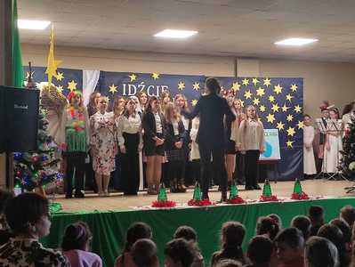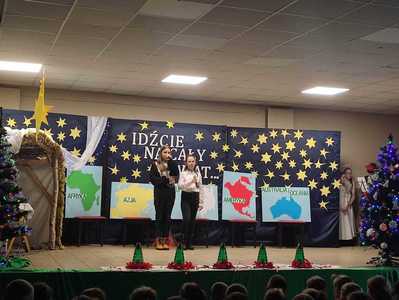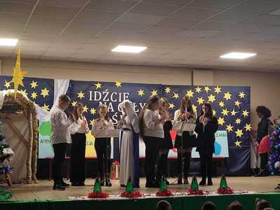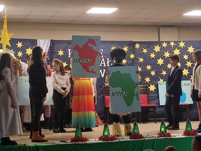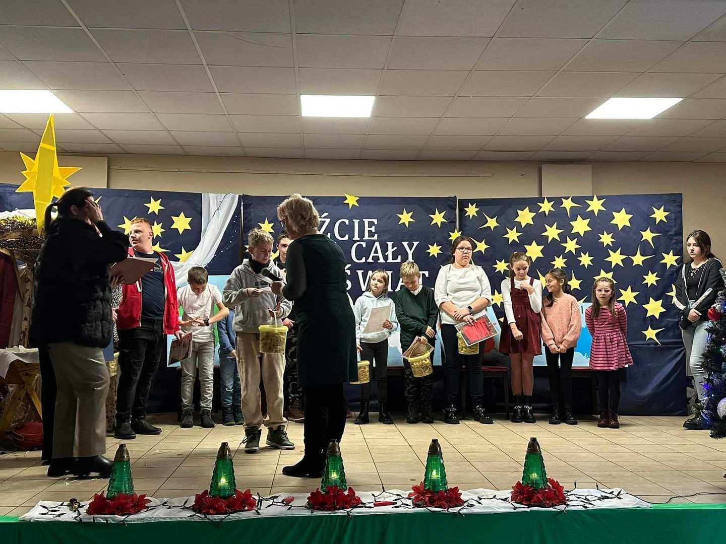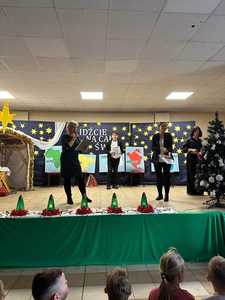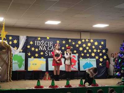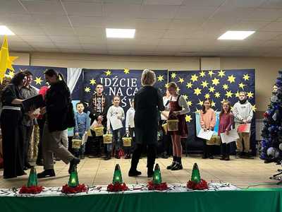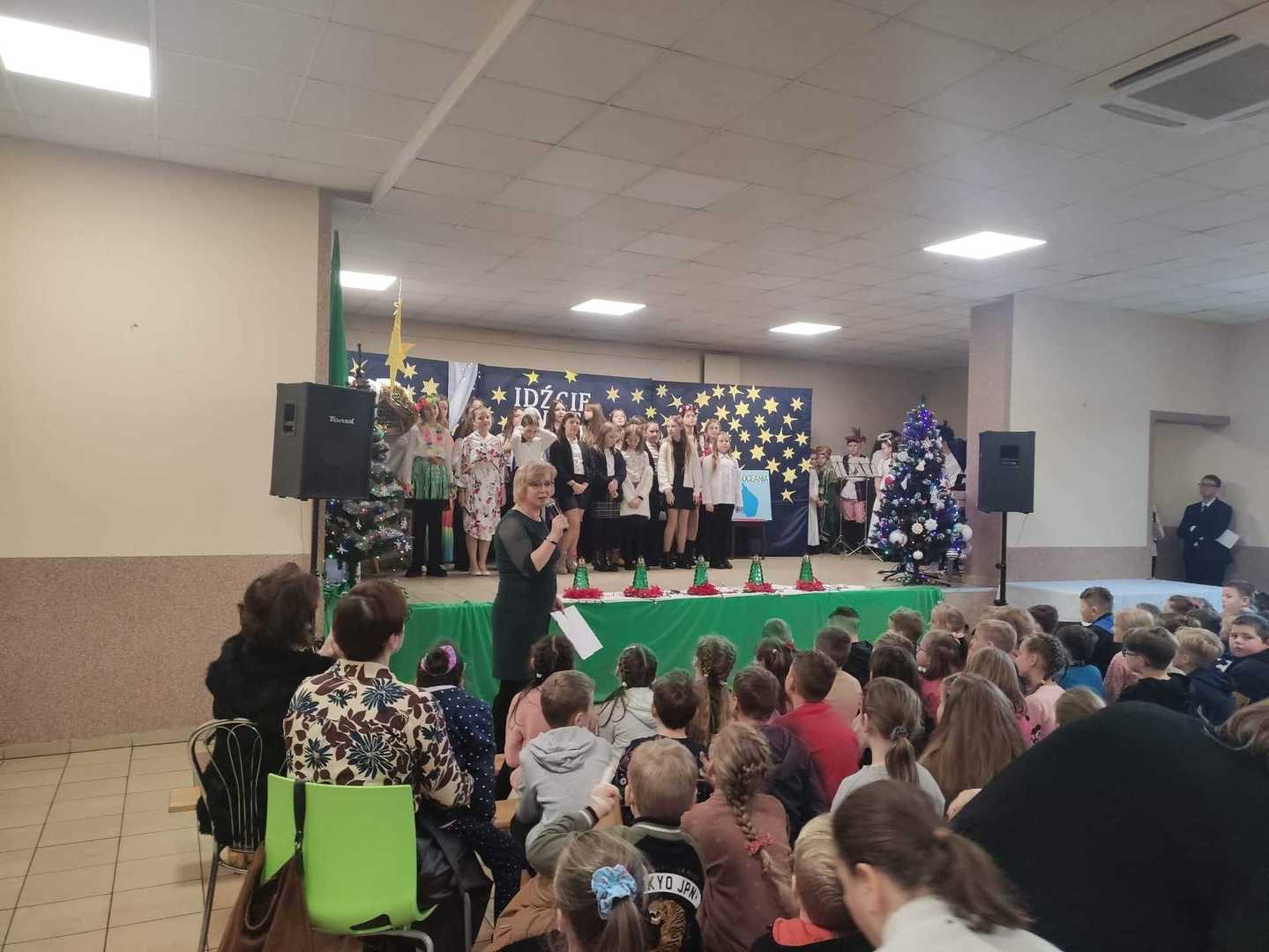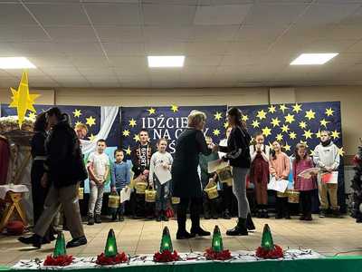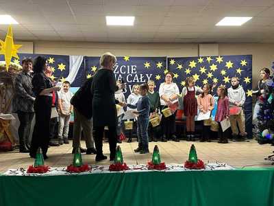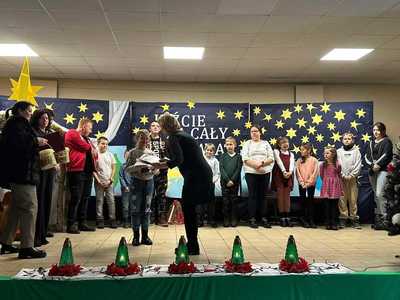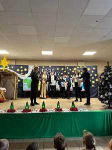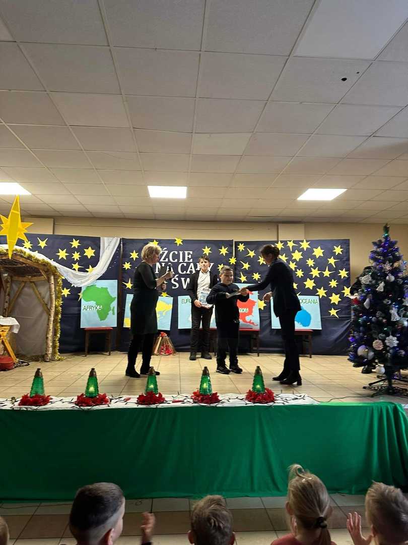 W świąteczny klimat wprowadziło nas przedstawienie Jasełek przygotowanych przez uczniów klasy 5 pod kierunkiem p. Sławomira Machaja i p. Izabeli Tomali. Po wysłuchaniu części artystycznej Pani Wicedyrektor ogłosiła wyniki konkursów związanych ze świętami Bożego Narodzenia zorganizowanych w naszej szkole.