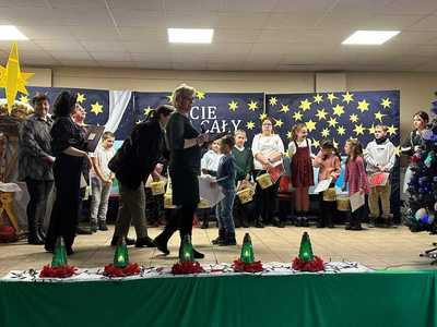20 grudnia o godzinie 10:00 na sali w Domu Kultury w Czajkowie zgromadzili się wszyscy uczniowie naszej szkoły wraz z nauczycielami i pracownikami obsługi oraz przewodniczącą Rady Rodziców, aby jeszcze przed świętami poczuć świąteczny nastrój.