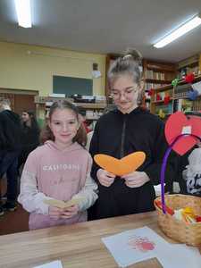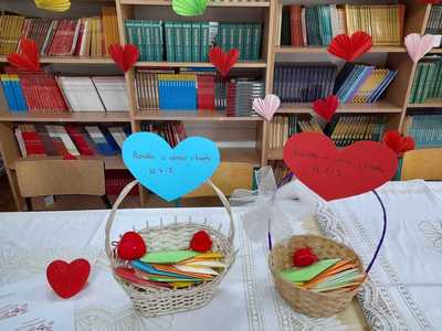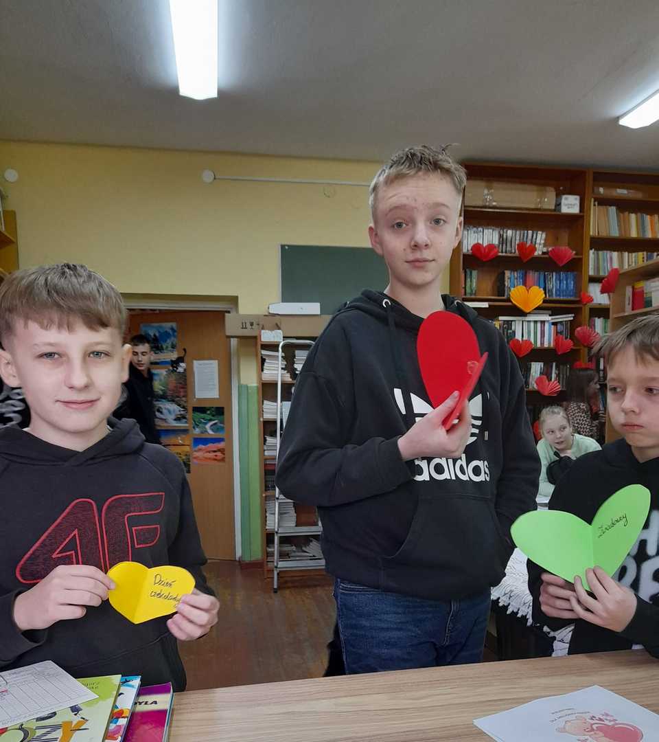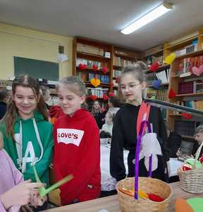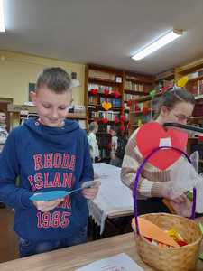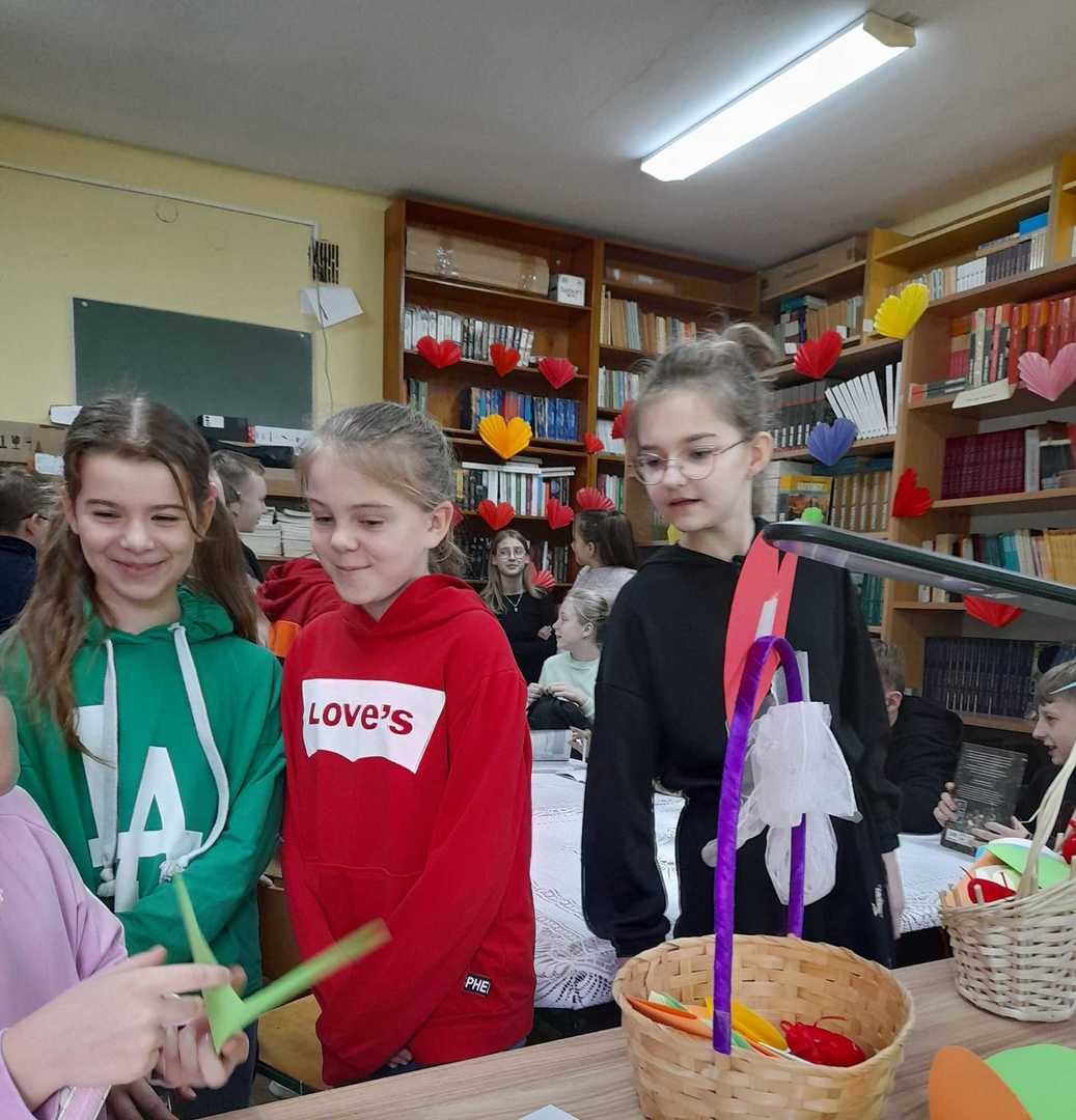 Uczniowie podchodzili do specjalnych koszyczków (osobno kl.1-3, 4-8) i losowali serduszko,