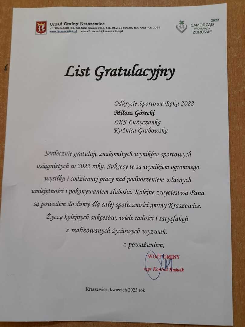Uczeń naszej szkoły, Miłosz Górecki z klasy pierwszej, otrzymał statuetkę za najlepsze osiągnięcia sportowe w 2022 roku.