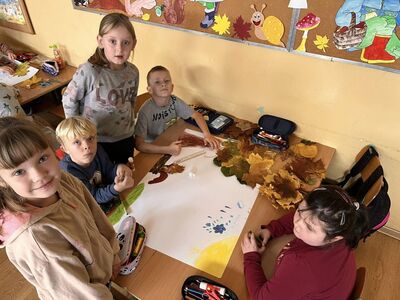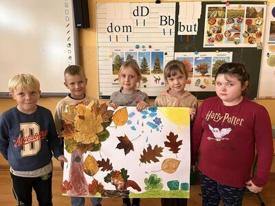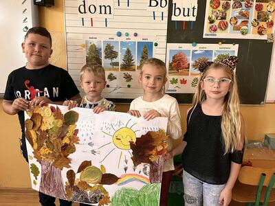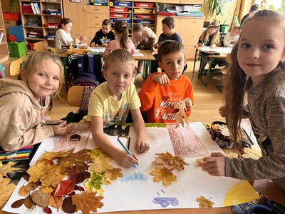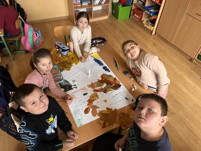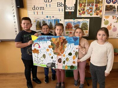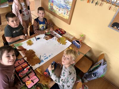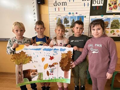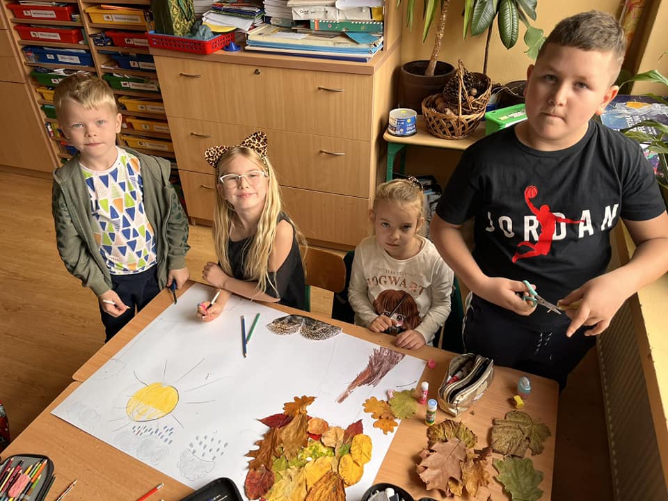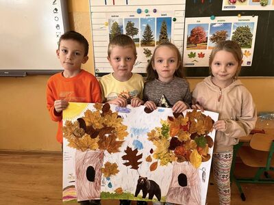Podczas dzisiejszych zajęć nasi pierwszoklasiści zostali podzieleni na grupy i wykonali prace plastyczne. Każdy zespół otrzymał leśne zwierzę i stworzył krajobraz jesienny. Nie trzeba było długo czekać na pomysłowe prace