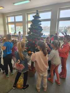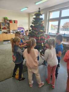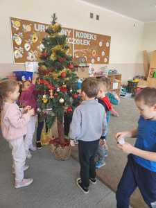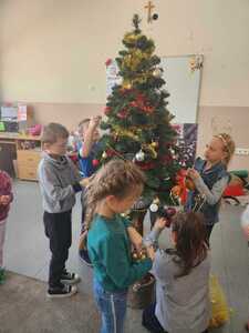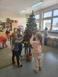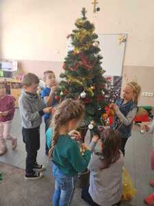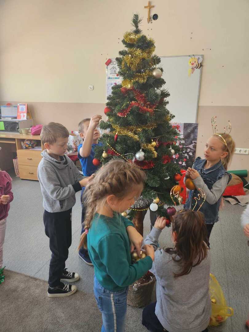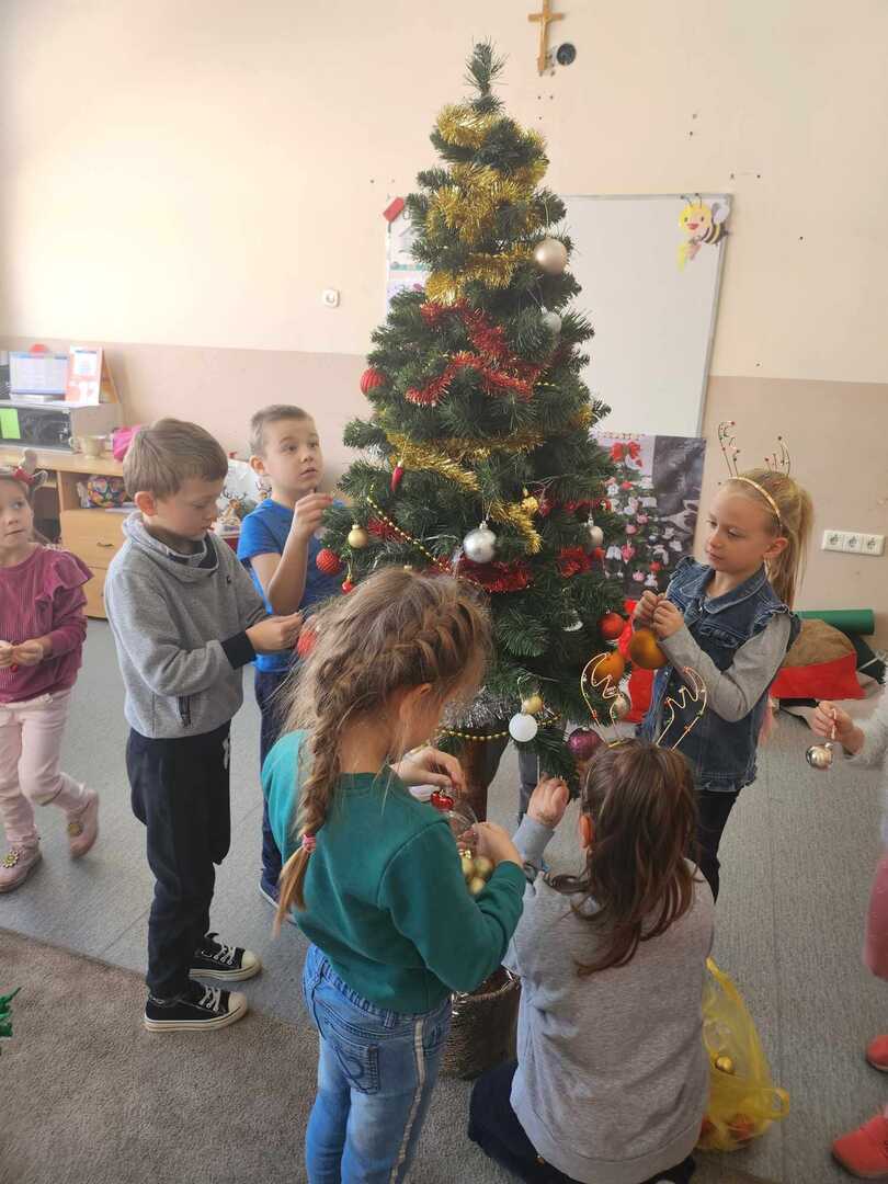 Święta Bożego Narodzenia wiążą się z tradycją ubierania świątecznego drzewka. W grupie 0a również nie mogło zabraknąć tego rytuału. Dzień ubierania choinki jest dniem wyjątkowym. Dzieci z wielkim zaangażowaniem zawieszały choinkowe ozdoby. Ileż było radości wśród dzieci a w grupie od razu zrobiło się świątecznie. Drzewko zostało przystrojone bardzo szybko, wygląda wyjątkowo i przypomina nam, że Święta Bożego Narodzenia już tuż, tuż…