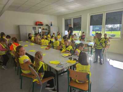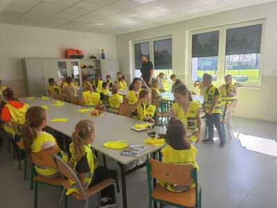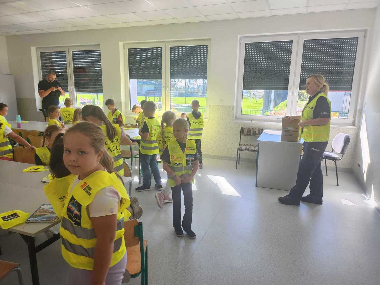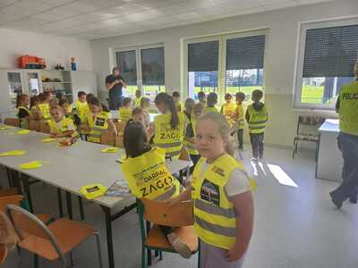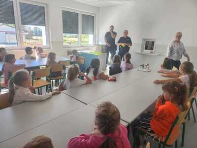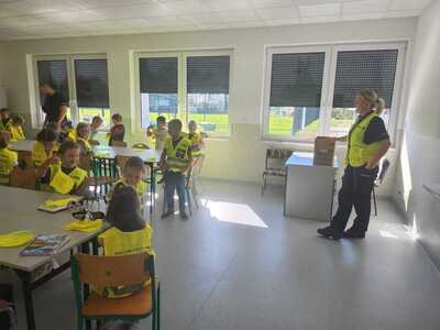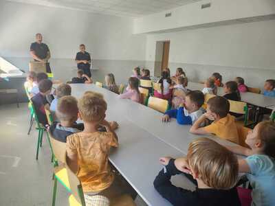 Podczas spotkania z uczniami klas pierwszych przeprowadzili pogadankę na temat zasad bezpiecznego poruszania się po drodze, zachowania się w sytuacji zagrożenia oraz w kontaktach z nieznajomymi. W trakcie rozmowy uczniowie mogli zadawać pytania, na które przedstawiciele władz chętnie odpowiadali. Dzieci otrzymały odblaskowe kamizelki.