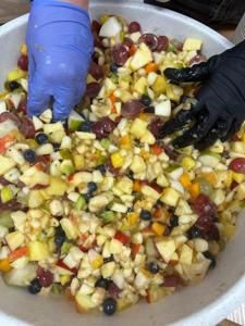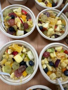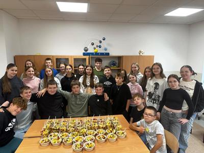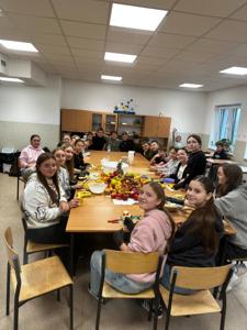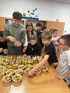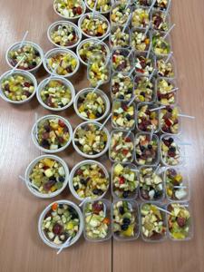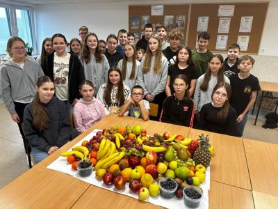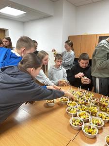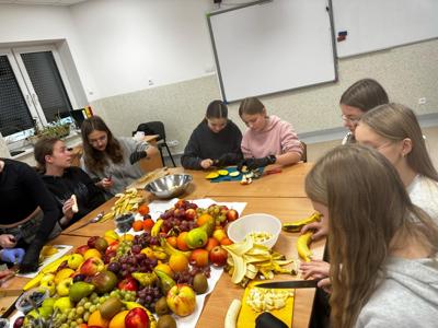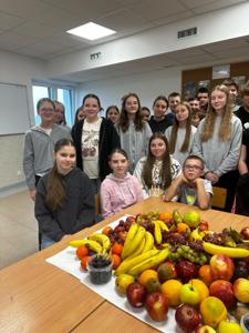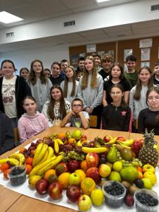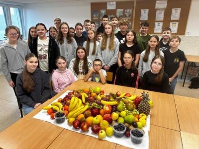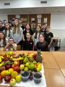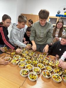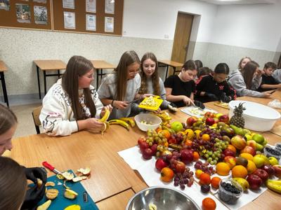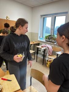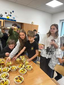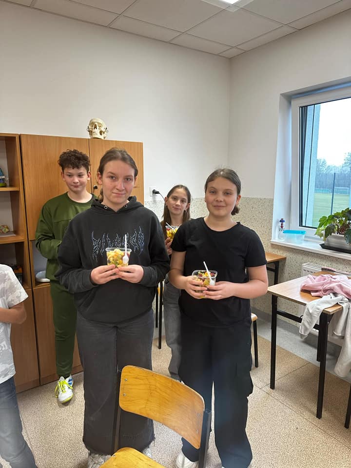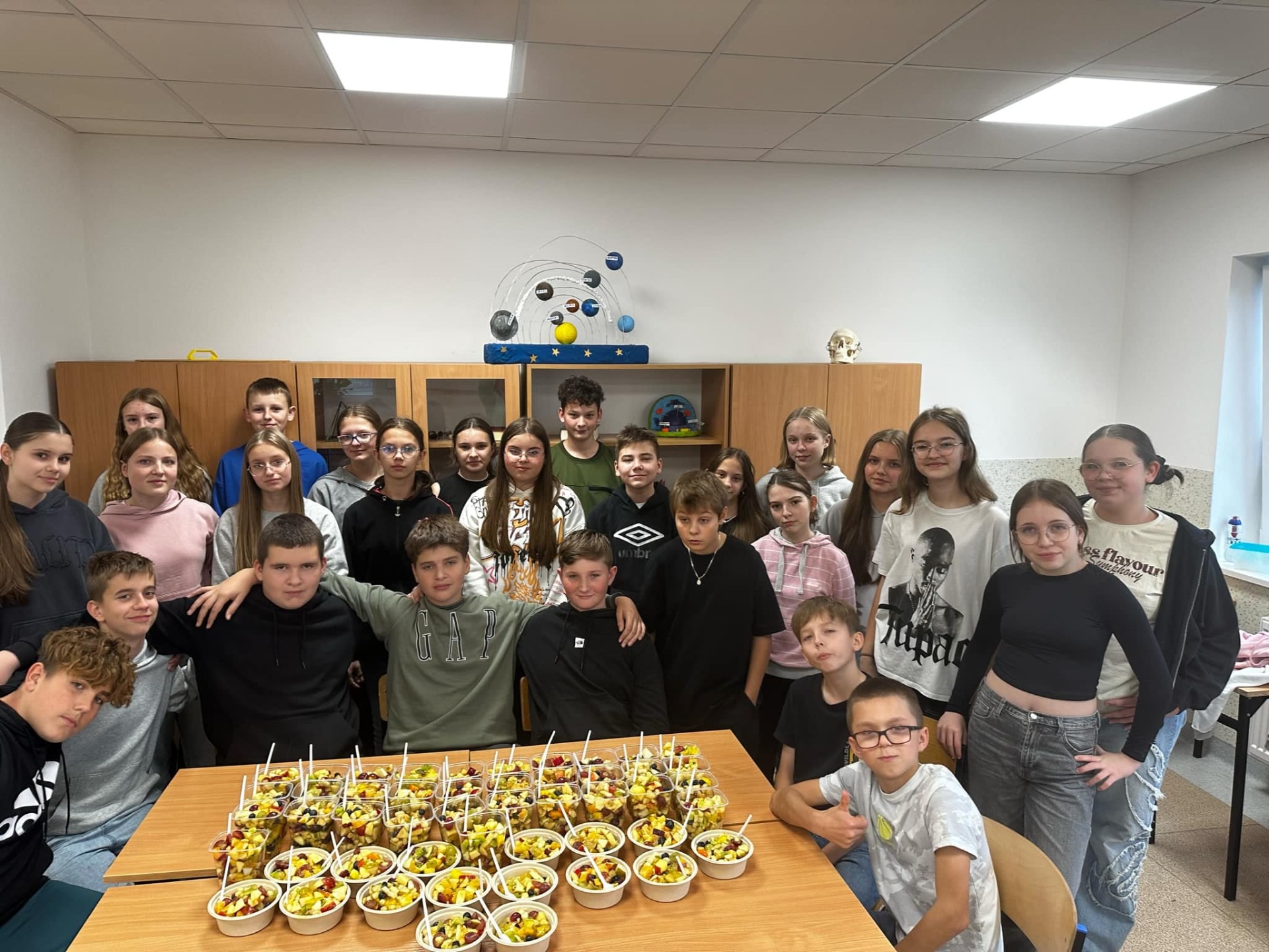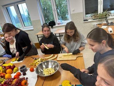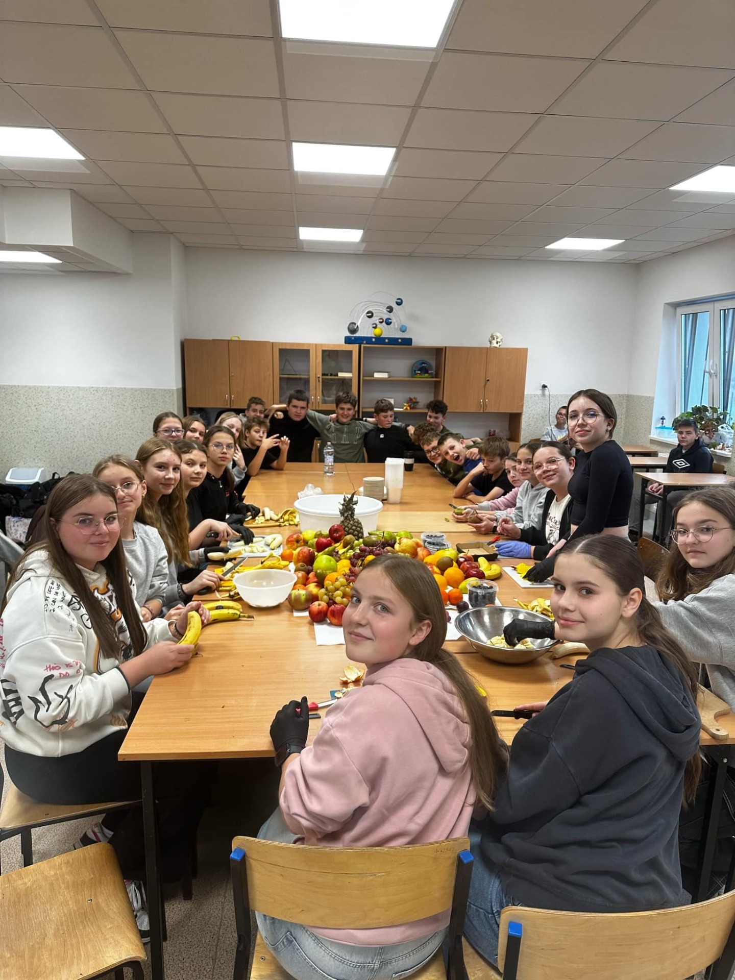Dzisiejsza lekcja biologii w kl.7 sprawiła uczniom wiele radości. W ramach programu „Trzymaj Formę” siódmoklasiści przygotowali pyszne i pełne witamin sałatki owocowe. Tematyka zajęć o witaminach i składnikach odżywczych nie była zrealizowana tylko w formie teoretycznej, ale również w praktyce