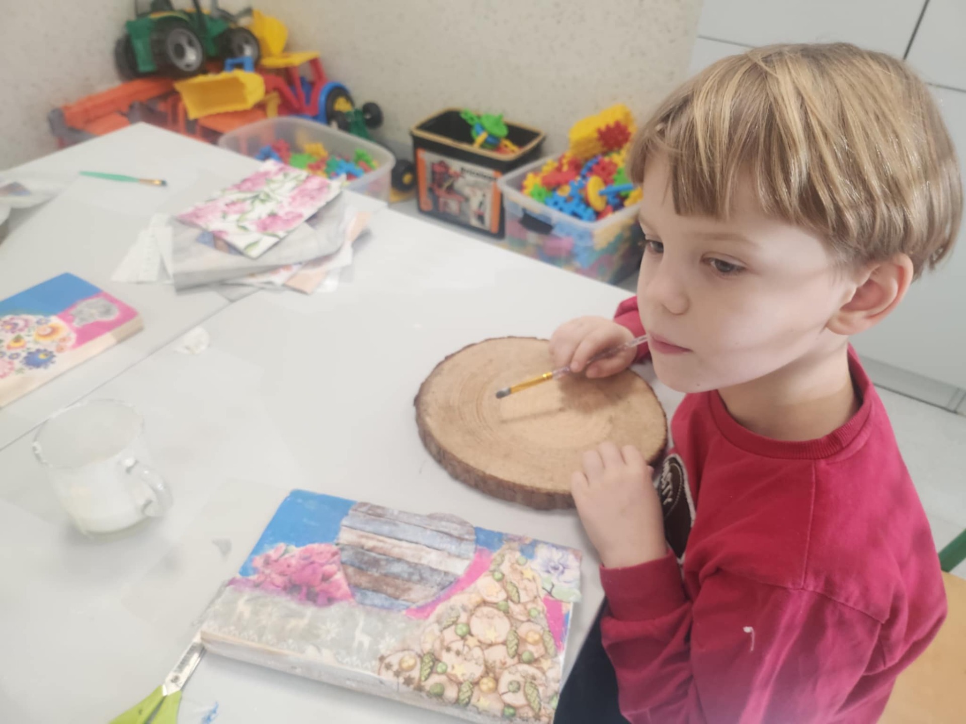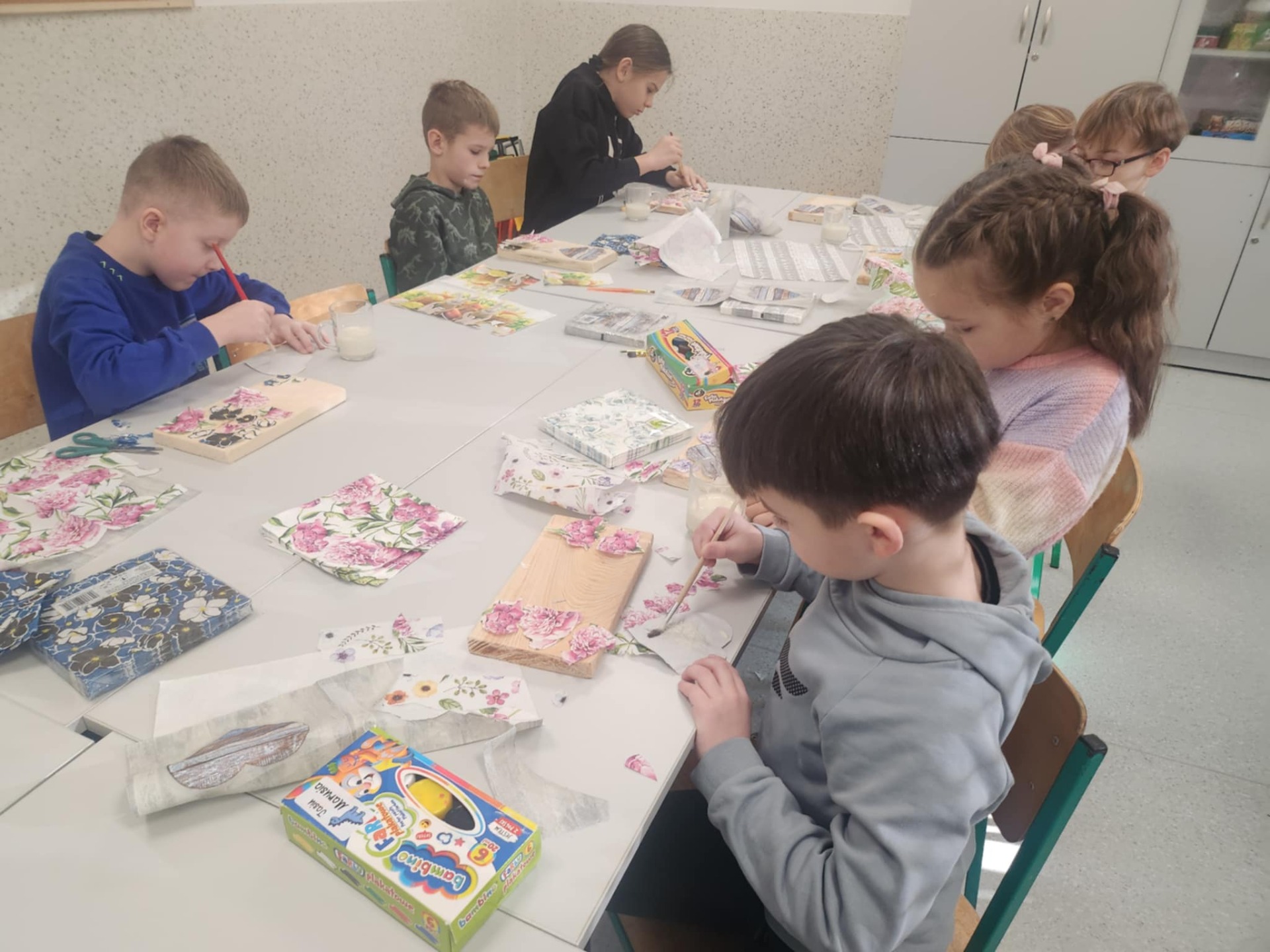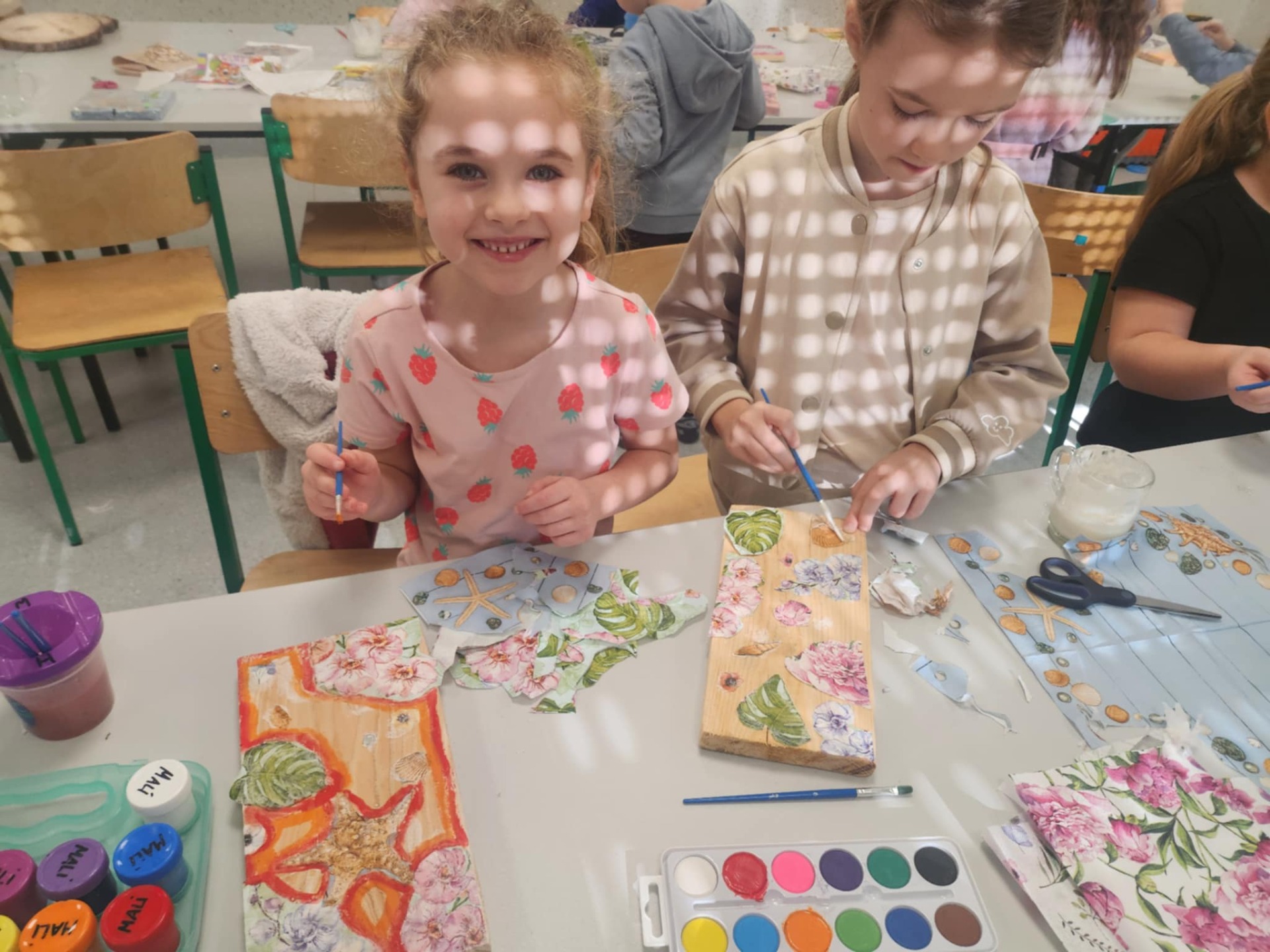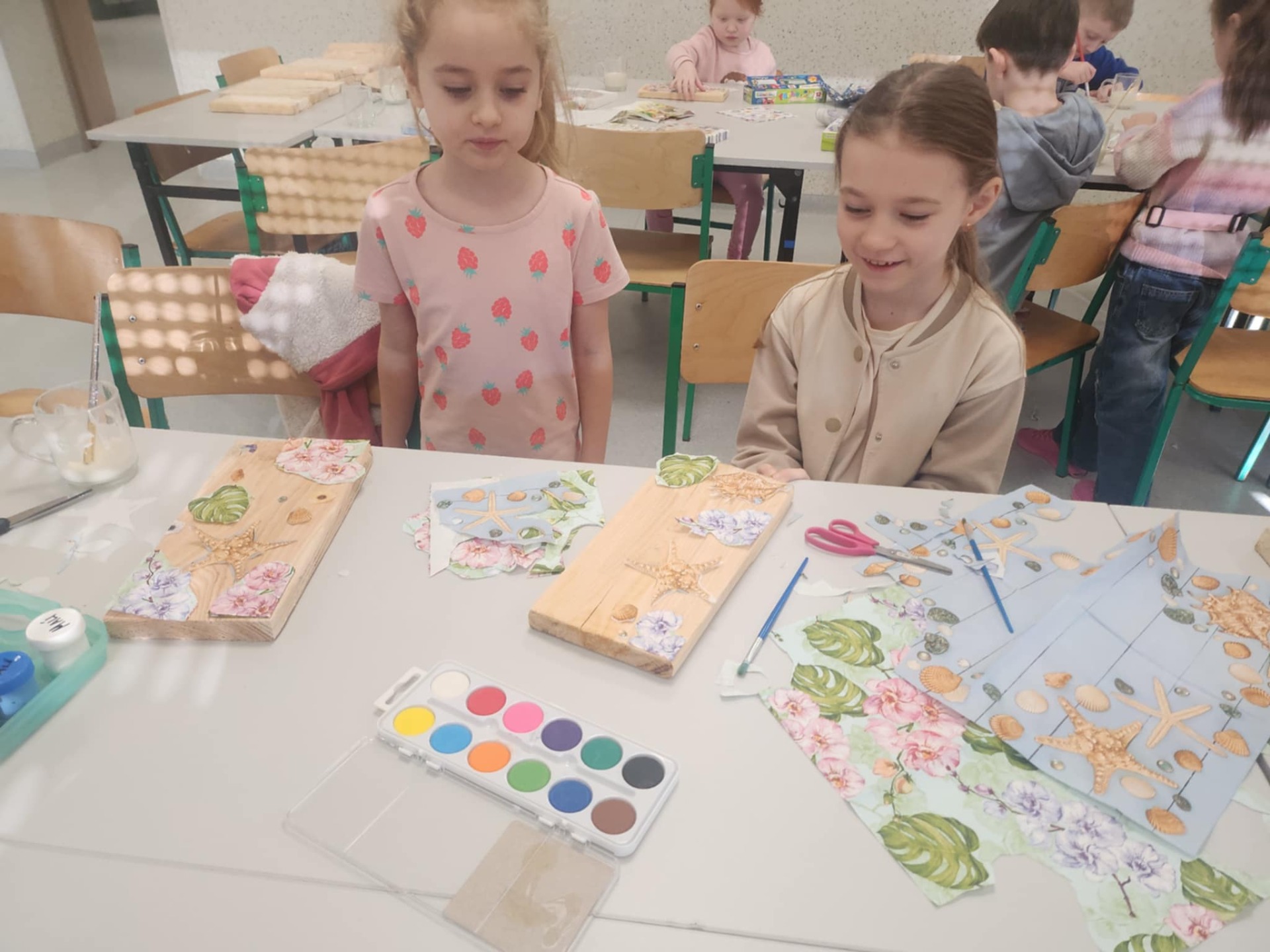 Warsztaty decoupage przyciągnęły spore grono małych artystów. Podczas tych zajęć uczestnicy poznali techniki ozdabiania przedmiotów metodą decoupage. Dzieci tworzyły unikalne dekoracje, ozdabiając drewniane deseczki. Zajęcia rozwijały kreatywność, cierpliwość i precyzję.