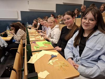 Po rozwiązaniu zadań finałowych uczniowie wzięli udział w warsztatach papierowego kumiko, czyli japońskiej papierowej układanki. W oryginale układanka wykonana jest z drewna i składa się ją bez użycia kleju czy gwoździ. Na potrzeby warsztatów uczniowie wycinali precyzyjnie paski z półkartonu i układali je w odpowiedni sposób.