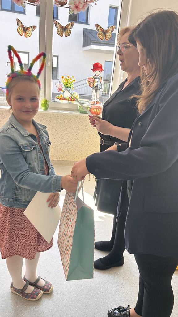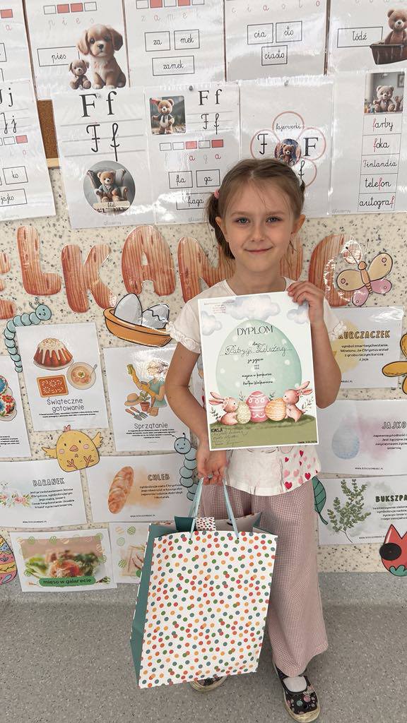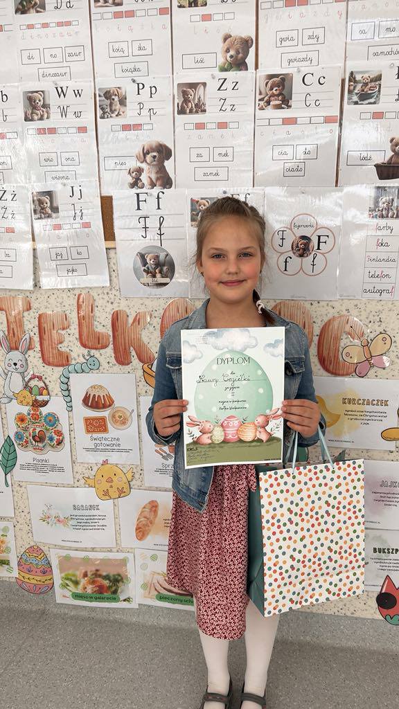W naszej szkole dla dzieci najmłodszych odbył się konkurs na najpiękniejszą kartkę wielkanocną. Uczestnicy wykazali się niezwykłą kreatywnością i starannością, tworząc prawdziwe małe dzieła sztuki. Komisja miała nie lada wyzwanie, by ocenić wszystkie prace i wyłonić zwycięzców – każda kartka zachwycała kolorami, pomysłowością i świątecznym klimatem. Zwyciężczynią konkursu została Hanna Bednarek. Drugie miejsce zdobyła Laura Cegiełka, a trzecie miejsce przypadło Patrycji Zeleźnej. Komisja postanowiła również przyznać wyróżnienie Franciszkowi Lubańskiemu.
