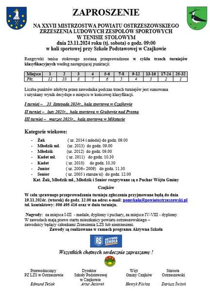 12 listopada 2024 Aktualności ZAPRASZAMY NA ZAWODY Zapraszamy na: NA XXVII MISTRZOSTWA POWIATU OSTRZESZOWSKIEGO ZRZESZENIA LUDOWYCH ZESPOŁÓW SPORTOWYCH W TENISIE STOŁOWYM Zawody odbędą się dnia 23.11.2024 roku (tj. sobota) o godz. 09:00 w hali... Czytaj więcej