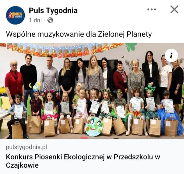 13 listopada 2024 Aktualności KONKURS POSENKI EKOLOGICZNEJ W piątek 8 listopada w Publicznym Integracyjnym Przedszkolu "Leśne Skrzaty" w Czajkowie odbył się konkurs piosenki ekologicznej. Grupę „0” reprezentował Jan Marusia. Chłopiec zwyciężył w kategorii... Czytaj więcej