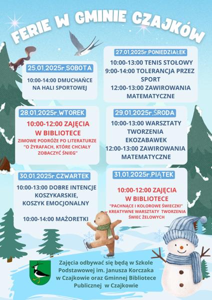 17 stycznia 2025 Aktualności FERIE W GMINIE CZAJKÓW Ferie w gminie Czajków odbędą się dzięki wsparciu Gminnej Komisji Rozwiązywania Problemów Alkoholowych w Czajkowie oraz Wójta Gminy Czajków. Czytaj więcej